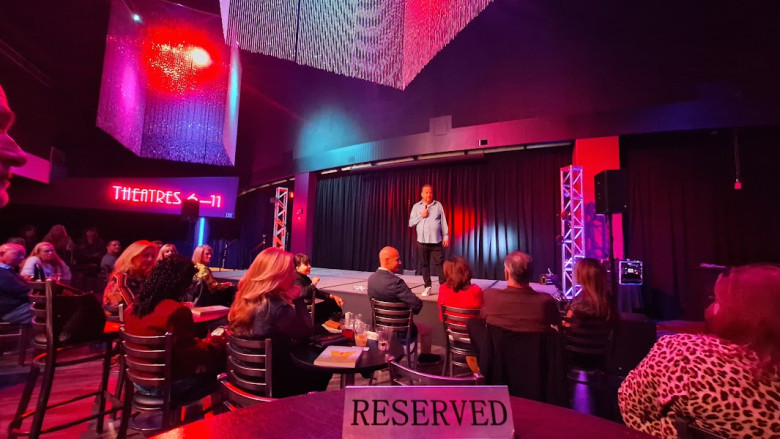 After a stirring encounter with the dead, we "crossed over" from NOTORIETY's "Chandelier Room" to the "Robin Leach Theater". There, we grabbed the last few minutes of VINNIE FAVORITO: UNFILTERED. The insult comic, who's somehow as adorable as he is abrasive, is always a great time.