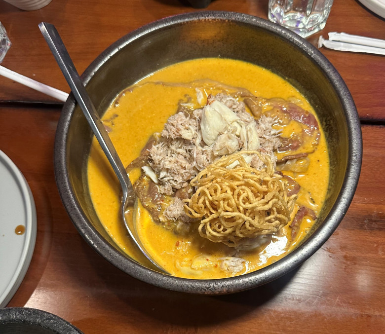 I dropped in on a recent Sunday night for dinner at KROK in Chinatown—and was glad to see that it was buzzing. On my second visit to this relatively new Thai eatery with a sexy and celebratory ambience, I went for the “splurge.” That’s the American rib eye Wagyu (thinly sliced), crab meat, egg noodle, and khao-soi curry (a coconut curry soup). This magical creation from Chef TK from Thailand dazzlingly holds multiple flavors, textures, and taste sensations. Bonus point: the tableside presentation of the dish is impressive. I’m all for food-as-burlesque, particularly when it tastes so damn good.